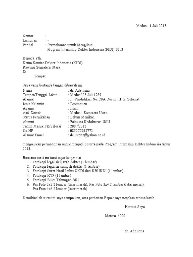 Bagi meraka yang masih mecari contoh surat permohonan praktikal, anda boleh rujuk di contoh surat permohonan latihan industri yang dapat dikongsikan pada . Contoh surat permohonan latihan industri latihan praktikal. Kepala komite internship dokter indonesia di jakarta · perihal : Permohonan pengajuan program dokter internship (pidi) 2013 · (dr. Hantar surat boleh, email pun boleh. Ibu ketua kidi wilayah lampung/.